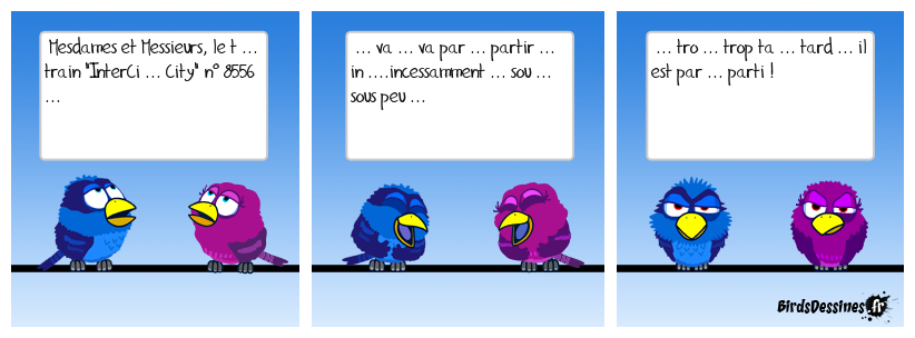 Case 1:Bird 1: Mesdames et Messieurs, le t ... train "InterCi ... City" n° 8556 ... | Case 2: Bird 1: ... va ... va par ... partir ... in ....incessamment ... sou ... sous peu ... | Case 3: Bird 1: ... tro ... trop ta ... tard ... il est par ... parti !