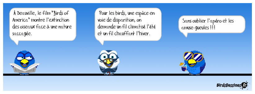 Case 1:Bird 1: À Deauville, le film "Birds of America" montre l’extinction des oiseaux face à une nature saccagée. | Case 2: Bird 1: Pour les birds, une espèce en voie de disparition, on demande un fil climatisé l’été et un fil chauffant l’hiver. | Case 3: Bird 1: Sans oublier l’apéro et les amuse-gueules !!!