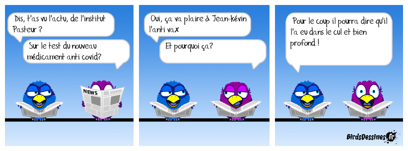 Case 1:Bird 1: Dis, t'as vu l'actu, de l'institut Pasteur ? Bird 2: Sur le test du nouveau médicament anti covid? | Case 2: Bird 1: Oui, ça va plaire à Jean-kévin l'anti vax Bird 2: Et pourquoi ça? | Case 3: Bird 1: Pour le coup il pourra dire qu'il l'a eu dans le cul et bien profond !