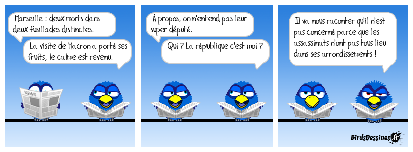 Case 1:Bird 1: Marseille : deux morts dans deux fusillades distinctes. Bird 2: La visite de Macron a porté ses fruits, le calme est revenu. | Case 2: Bird 1: À propos, on n'entend pas leur super député. Bird 2: Qui ? La république c'est moi ? | Case 3: Bird 1: Il va nous raconter qu'il n'est pas concerné parce que les assassinats n'ont pas tous lieu dans ses arrondissements !