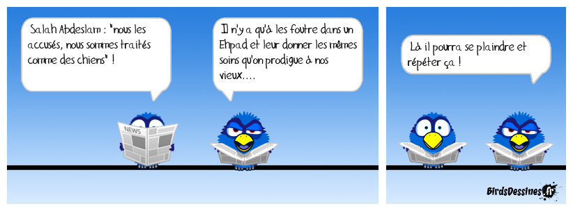 Case 1:Bird 1: Salah Abdeslam : "nous les accusés, nous sommes traités comme des chiens" ! | Case 2: Bird 1: Il n'y a qu'à les foutre dans un Ehpad et leur donner les mêmes soins qu'on prodigue à nos vieux.... | Case 3: Bird 1: Là il pourra se plaindre et répéter ça !