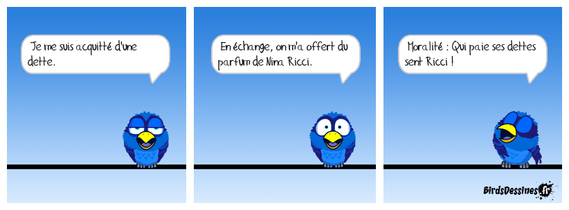 Case 1:Bird 1: Je me suis acquitté d'une dette. | Case 2: Bird 1: En échange, on m'a offert du parfum de Nina Ricci. | Case 3: Bird 1: Moralité : Qui paie ses dettes sent Ricci !