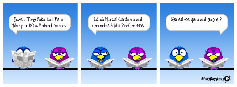 Case 1:Bird 1: Boxe : Tony Yoka bat Petar Milas par KO à Roland-Garros. | Case 2: Bird 1: Là où Marcel Cerdan avait rencontré Èdith Piaf en 1946. | Case 3: Bird 1: Qui est-ce qui avait gagné ?