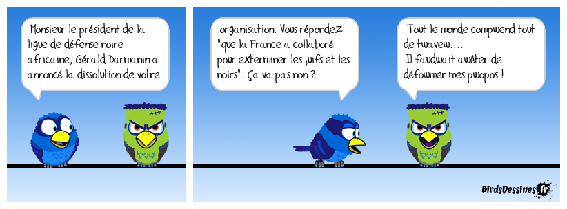 Case 1:Bird 1: Monsieur le président de la ligue de défense noire africaine, Gérald Darmanin a annoncé la dissolution de votre | Case 2: Bird 1: organisation. Vous répondez "que la France a collaboré pour exterminer les juifs et les noirs". Ça va pas non ? | Case 3: Bird 1: Tout le monde compwend tout de twavew.... Il faudwait awêter de défowmer mes pwopos !