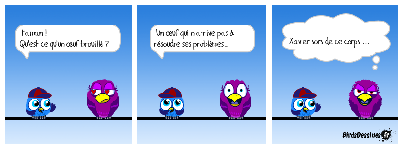 Case 1:Bird 1: Maman ! Qu'est ce qu'un œuf brouillé ?Bird 2: oui Théo ! | Case 2: Bird 1: Un œuf qui n arrive pas à résoudre ses problèmes… Bird 2: ??? | Case 3: Bird 1: Xavier sors de ce corps ...
