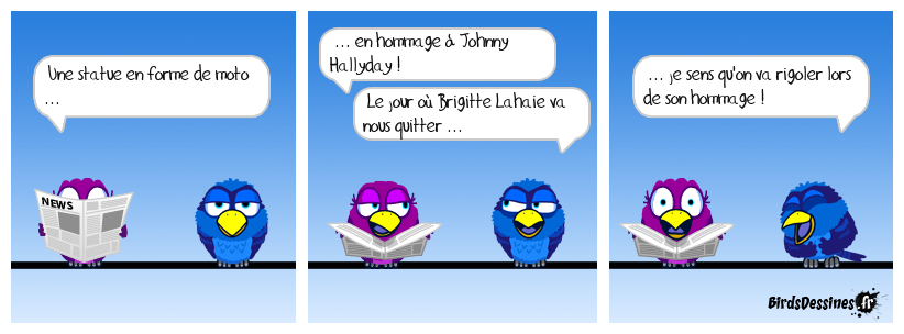 Case 1:Bird 1: Une statue en forme de moto ... | Case 2: Bird 1: ... en hommage à Johnny Hallyday ! Bird 2: Le jour où Brigitte Lahaie va nous quitter ... | Case 3: Bird 1: ... je sens qu'on va rigoler lors de son hommage !