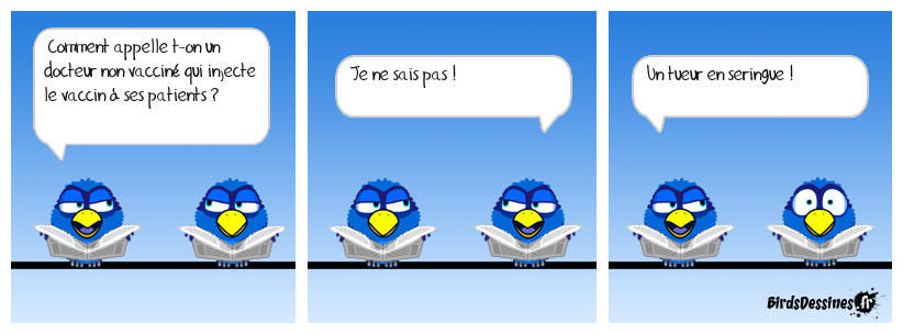 Case 1:Bird 1: Comment appelle t-on un docteur non vacciné qui injecte le vaccin à ses patients ? | Case 2: Bird 1: Je ne sais pas ! | Case 3: Bird 1: Un tueur en seringue !