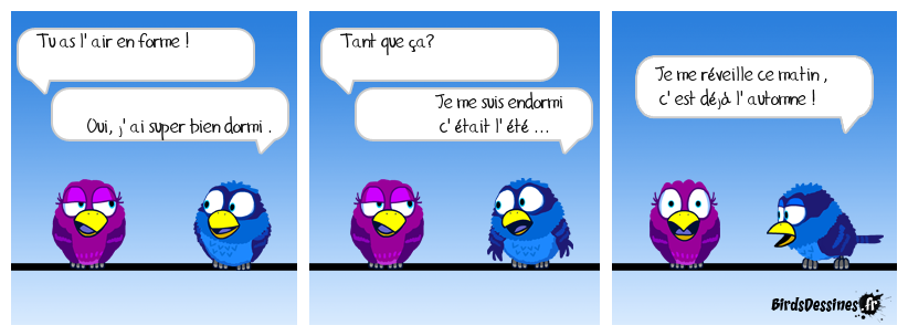 Case 1:Bird 1: Tu as l' air en forme !Bird 2: Oui, j' ai super bien dormi . | Case 2: Bird 1: Tant que ça? Bird 2: Je me suis endormi c' était l' été ... | Case 3: Bird 1: Je me réveille ce matin , c' est déjà l' automne !