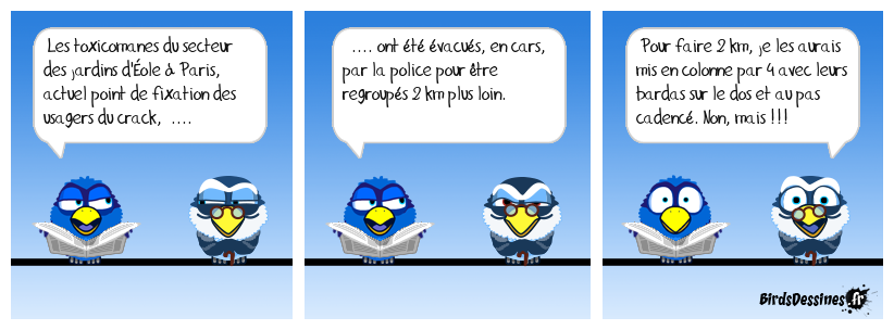 Case 1:Bird 1: Les toxicomanes du secteur des jardins d'Èole à Paris, actuel point de fixation des usagers du crack, .... | Case 2: Bird 1: .... ont été évacués, en cars, par la police pour être regroupés 2 km plus loin. | Case 3: Bird 1: Pour faire 2 km, je les aurais mis en colonne par 4 avec leurs bardas sur le dos et au pas cadencé. Non, mais !!!