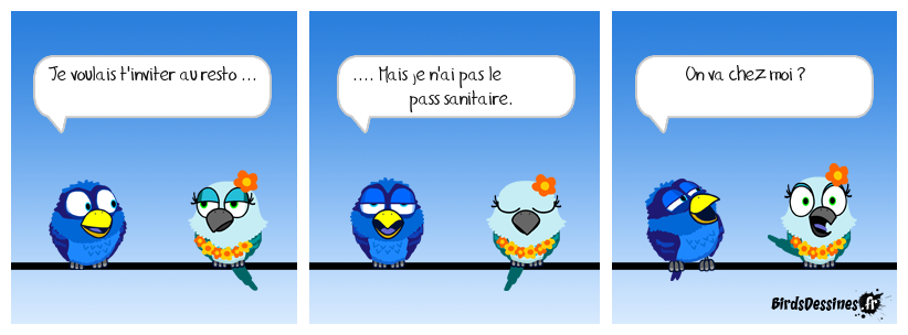 Case 1:Bird 1: Je voulais t'inviter au resto ... | Case 2: Bird 1: .... Mais je n'ai pas le pass sanitaire. | Case 3: Bird 1: On va chez moi ?