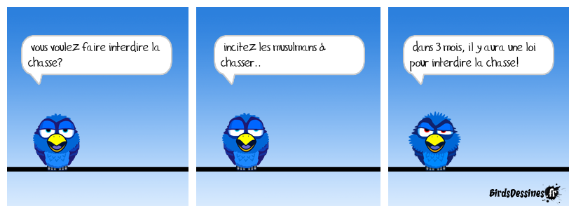 Case 1:Bird 1: vous voulez faire interdire la chasse? | Case 2: Bird 1: incitez les musulmans à chasser.. | Case 3: Bird 1: dans 3 mois, il y aura une loi pour interdire la chasse!