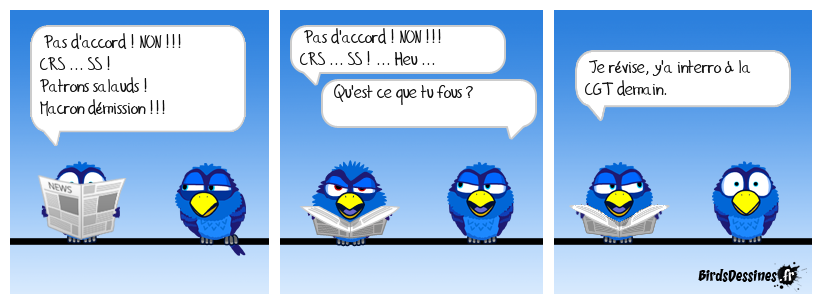 Case 1:Bird 1: Pas d'accord ! NON !!! CRS ... SS ! Patrons salauds ! Macron démission !!! | Case 2: Bird 1: Pas d'accord ! NON !!! CRS ... SS ! ... Heu ... Bird 2: Qu'est ce que tu fous ? | Case 3: Bird 1: Je révise, y'a interro à la CGT demain.