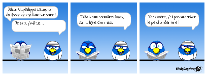 Case 1:Bird 1: Julian Alaphilippe champion du Monde de cyclisme sur route !Bird 2: Je sais, j'y étais... | Case 2: Bird 1: J'étais aux premières loges, sur la ligne d'arrivée. | Case 3: Bird 1: Par contre, j'ai pas vu arriver le peloton derrière !