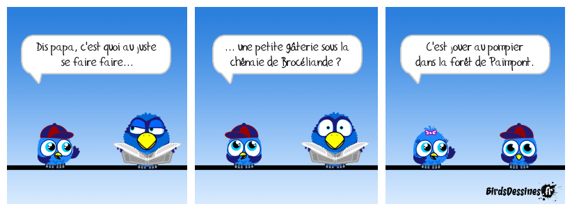 Case 1:Bird 1: Dis papa, c'est quoi au juste se faire faire... | Case 2: Bird 1: ... une petite gâterie sous la chênaie de Brocéliande ? | Case 3: Bird 1: C'est jouer au pompier dans la forêt de Paimpont.