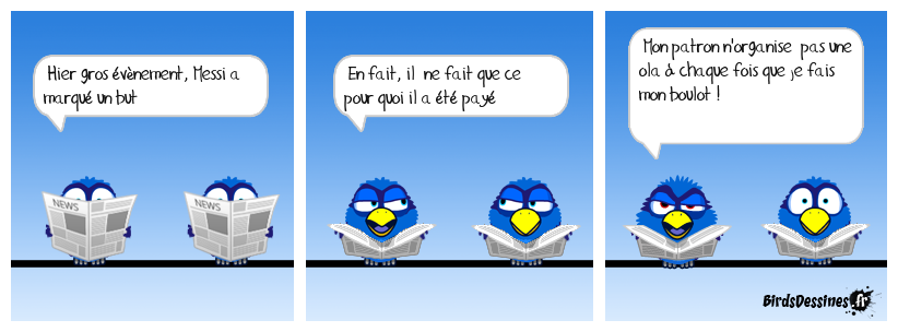 Case 1:Bird 1: Hier gros évènement, Messi a marqué un but | Case 2: Bird 1: En fait, il ne fait que ce pour quoi il a été payé | Case 3: Bird 1: Mon patron n'organise pas une ola à chaque fois que je fais mon boulot !
