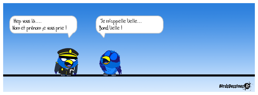 Case 1:Bird 1: Hep vous là.... Nom et prénom je vous prie ! | Case 2: Bird 1: Je m'appelle Uelle... Bond Uelle ! | Case 3: