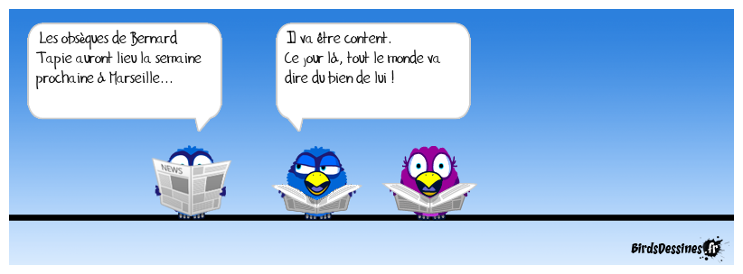 Case 1:Bird 1: Les obsèques de Bernard Tapie auront lieu la semaine prochaine à Marseille... | Case 2: Bird 1: Il va être content. Ce jour là, tout le monde va dire du bien de lui ! | Case 3: