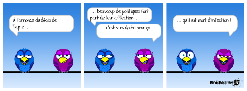 Case 1:Bird 1: À l'annonce du décès de Tapie ... | Case 2: Bird 1: ... beaucoup de politiques font part de leur affection ... Bird 2: ... c'est sans doute pour ça ... | Case 3: Bird 1: ... qu'il est mort d'infection !