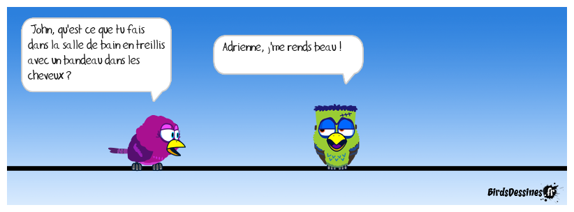 Case 1:Bird 1: John, qu'est ce que tu fais dans la salle de bain en treillis avec un bandeau dans les cheveux ? | Case 2: Bird 1: Adrienne, j'me rends beau ! | Case 3:
