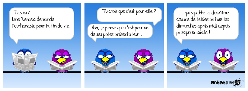 Case 1:Bird 1: T'as vu ? Line Renaud demande l'euthanasie pour la fin de vie. | Case 2: Bird 1: Tu crois que c'est pour elle ? Bird 2: Non, je pense que c'est pour un de ses potes présentateur... | Case 3: Bird 1: ... qui squatte la deuxième chaine de télévision tous les dimanches après midi depuis presque un siècle !