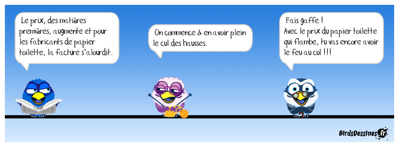 Case 1:Bird 1: Le prix, des matières premières, augmente et pour les fabricants de papier toilette, la facture s’alourdit. | Case 2: Bird 1: On commence à en avoir plein le cul des hausses. | Case 3: Bird 1: Fais gaffe ! Avec le prix du papier toilette qui flambe, tu vas encore avoir le feu au cul !!!