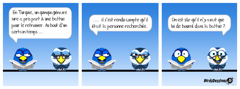 Case 1:Bird 1: En Turquie, un quinquagénaire ivre a pris part à une battue pour le retrouver. Au bout d’un certain temps ... | Case 2: Bird 1: .... il s’est rendu compte qu’il était la personne recherchée. | Case 3: Bird 1: On est sûr qu’il n’y avait que lui de bourré dans la battue ?
