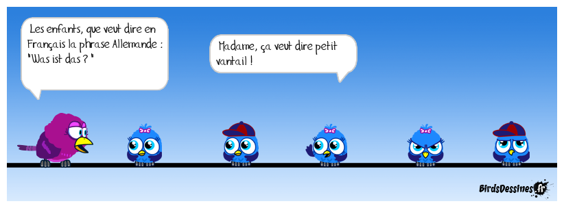 Case 1:Bird 1: Les enfants, que veut dire en Français la phrase Allemande : "Was ist das ? " | Case 2: Bird 1: Madame, ça veut dire petit vantail ! | Case 3:
