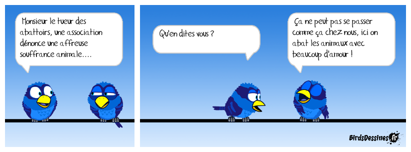 Case 1:Bird 1: Monsieur le tueur des abattoirs, une association dénonce une affreuse souffrance animale.... | Case 2: Bird 1: Qu'en dites vous ? | Case 3: Bird 1: Ça ne peut pas se passer comme ça chez nous, ici on abat les animaux avec beaucoup d'amour !