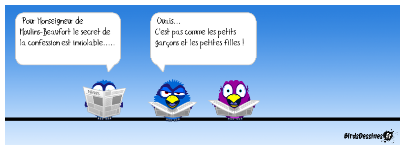 Case 1:Bird 1: Pour Monseigneur de Moulins-Beaufort le secret de la confession est inviolable..... | Case 2: Bird 1: Ouais... C'est pas comme les petits garçons et les petites filles ! | Case 3: