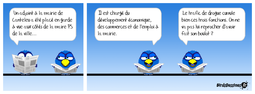 Case 1:Bird 1: Un adjoint à la mairie de Canteleu a été placé en garde à vue aux côtés de la maire PS de la ville... | Case 2: Bird 1: Il est chargé du développement économique, des commerces et de l'emploi à la mairie. | Case 3: Bird 1: Le trafic de drogue cumule bien ces trois fonctions. On ne va pas lui reprocher d'avoir fait son boulot ?
