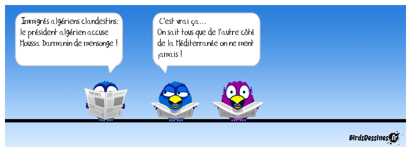Case 1:Bird 1: Immigrés algériens clandestins: le président algérien accuse Moussa Darmanin de mensonge ! | Case 2: Bird 1: C'est vrai ça... On sait tous que de l'autre côté de la Méditerranée on ne ment jamais ! | Case 3: