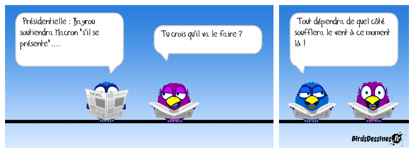 Case 1:Bird 1: Présidentielle : Bayrou soutiendra Macron "s'il se présente".... | Case 2: Bird 1: Tu crois qu'il va le faire ? | Case 3: Bird 1: Tout dépendra de quel côté soufflera le vent à ce moment là !