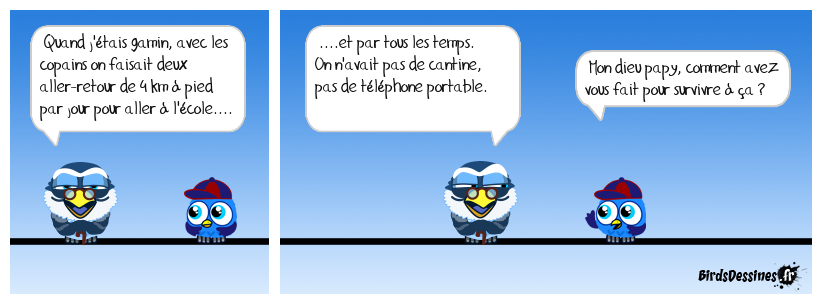 Case 1:Bird 1: Quand j'étais gamin, avec les copains on faisait deux aller-retour de 4 km à pied par jour pour aller à l'école.... | Case 2: Bird 1: ....et par tous les temps. On n'avait pas de cantine, pas de téléphone portable. | Case 3: Bird 1: Mon dieu papy, comment avez vous fait pour survivre à ça ?