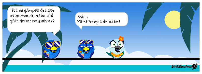Case 1:Bird 1: Tu crois qu'on peut dire d'un homme tronc franchouillard qu'il a des racines gauloises ? | Case 2: Bird 1: Oui,... S'il est Français de souche ! | Case 3: