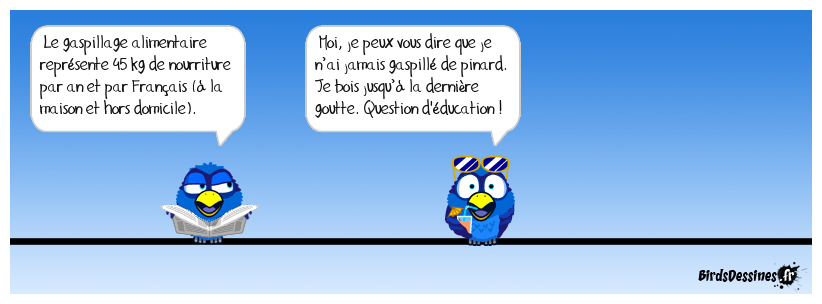 Case 1:Bird 1: Le gaspillage alimentaire représente 45 kg de nourriture par an et par Français (à la maison et hors domicile). | Case 2: Bird 1: Moi, je peux vous dire que je n’ai jamais gaspillé de pinard. Je bois jusqu’à la dernière goutte. Question d'éducation ! | Case 3: