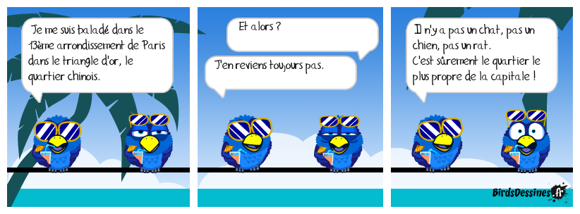 Case 1:Bird 1: Je me suis baladé dans le 13ème arrondissement de Paris dans le triangle d'or, le quartier chinois. | Case 2: Bird 1: Et alors ? Bird 2: J'en reviens toujours pas. | Case 3: Bird 1: Il n'y a pas un chat, pas un chien, pas un rat. C'est sûrement le quartier le plus propre de la capitale !