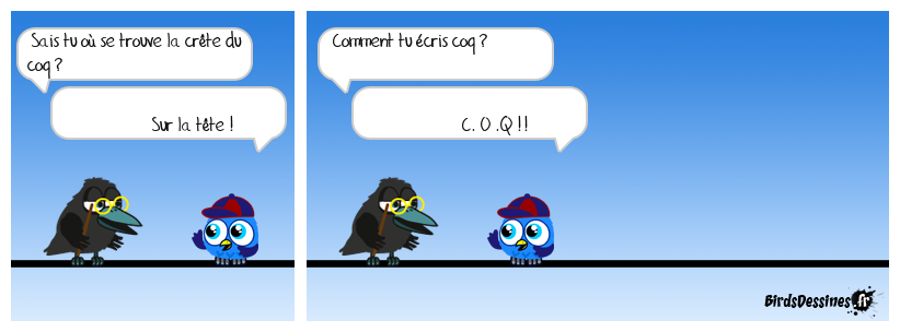 Case 1:Bird 1: Sais tu où se trouve la crête du coq ?Bird 2: Sur la tête ! | Case 2: Bird 1: Comment tu écris coq ? Bird 2: C. O .Q !! | Case 3: