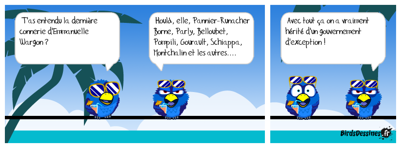 Case 1:Bird 1: T'as entendu la dernière connerie d'Emmanuelle Wargon ? | Case 2: Bird 1: Houlà, elle, Pannier-Runacher Borne, Parly, Belloubet, Pompili, Gourault, Schiappa, Montchalin et les autres.... | Case 3: Bird 1: Avec tout ça on a vraiment hérité d'un gouvernement d'exception !