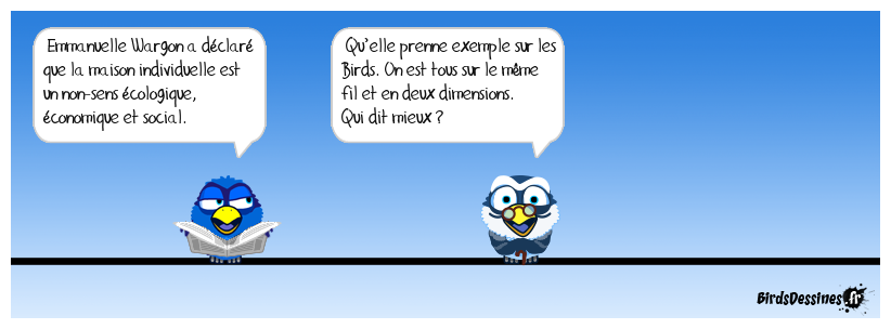 Case 1:Bird 1: Emmanuelle Wargon a déclaré que la maison individuelle est un non-sens écologique, économique et social. | Case 2: Bird 1: Qu’elle prenne exemple sur les Birds. On est tous sur le même fil et en deux dimensions. Qui dit mieux ? | Case 3: