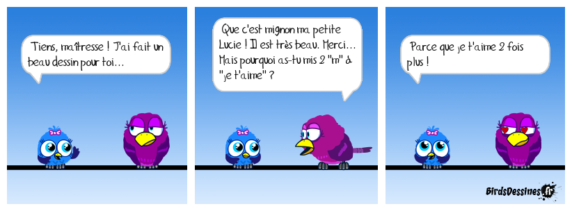 Case 1:Bird 1: Tiens, maïtresse ! J'ai fait un beau dessin pour toi... | Case 2: Bird 1: Que c'est mignon ma petite Lucie ! Il est très beau. Merci... Mais pourquoi as-tu mis 2 ''m'' à ''je t'aime'' ? | Case 3: Bird 1: Parce que je t'aime 2 fois plus !
