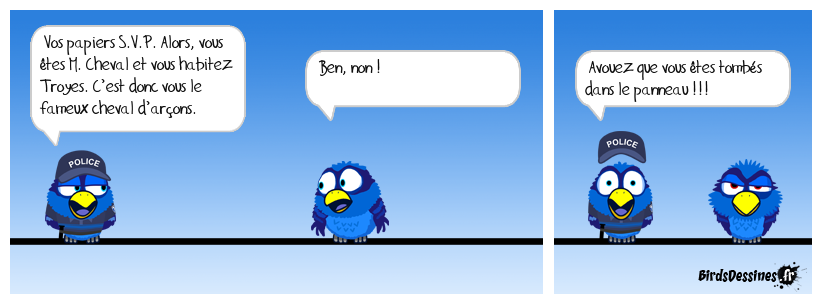 Case 1:Bird 1: Vos papiers S.V.P. Alors, vous êtes M. Cheval et vous habitez Troyes. C’est donc vous le fameux cheval d’arçons. | Case 2: Bird 1: Ben, non ! | Case 3: Bird 1: Avouez que vous êtes tombés dans le panneau !!!