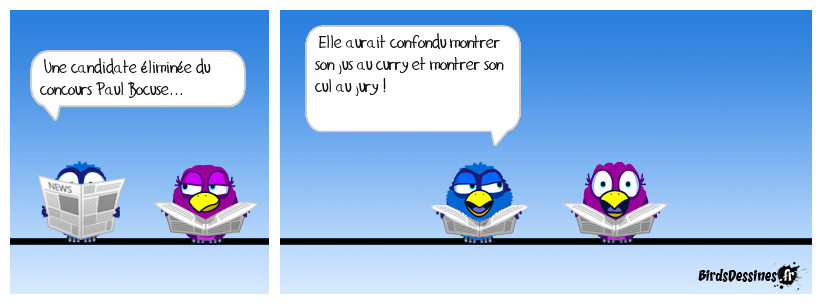 Case 1:Bird 1: Une candidate éliminée du concours Paul Bocuse... | Case 2: Bird 1: Elle aurait confondu montrer son jus au curry et montrer son cul au jury ! | Case 3: