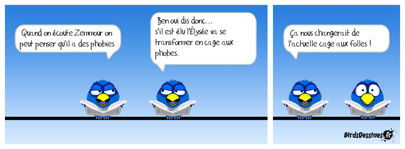 Case 1:Bird 1: Quand on écoute Zemmour on peut penser qu'il a des phobies | Case 2: Bird 1: Ben oui dis donc... s'il est élu l'Èlysée va se transformer en cage aux phobes. | Case 3: Bird 1: Ça nous changerait de l'actuelle cage aux folles !