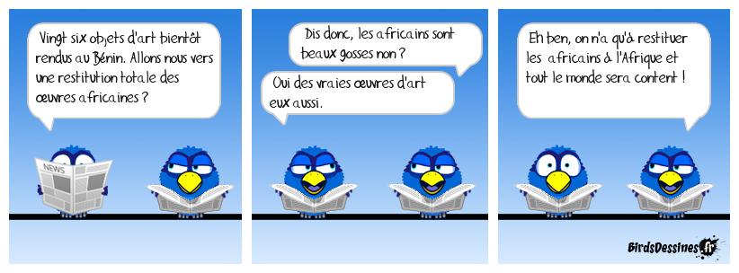 Case 1:Bird 1: Vingt six objets d'art bientôt rendus au Bénin. Allons nous vers une restitution totale des œuvres africaines ? | Case 2: Bird 1: Dis donc, les africains sont beaux gosses non ? Bird 2: Oui des vraies œuvres d'art eux aussi. | Case 3: Bird 1: Eh ben, on n'a qu'à restituer les africains à l'Afrique et tout le monde sera content !
