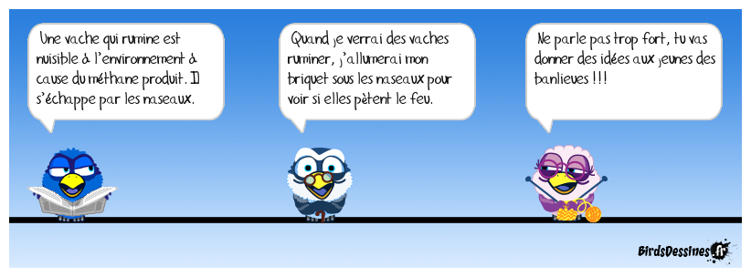 Case 1:Bird 1: Une vache qui rumine est nuisible à l’environnement à cause du méthane produit. Il s’échappe par les naseaux. | Case 2: Bird 1: Quand je verrai des vaches ruminer, j’allumerai mon briquet sous les naseaux pour voir si elles pètent le feu. | Case 3: Bird 1: Ne parle pas trop fort, tu vas donner des idées aux jeunes des banlieues !!!