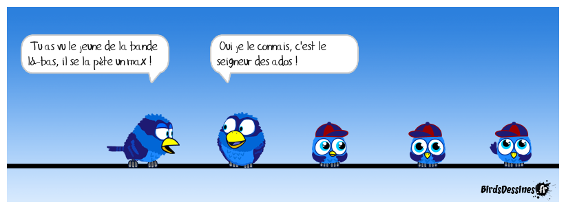 Case 1:Bird 1: Tu as vu le jeune de la bande là-bas, il se la pète un max ! | Case 2: Bird 1: Oui je le connais, c'est le seigneur des ados ! | Case 3: