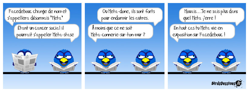 Case 1:Bird 1: Facedebouc change de nom et s'appellera désormais "Meta" Bird 2: Étant un cancer social il pourrait s'appeler Meta-stase | Case 2: Bird 1: Ou Meta-done, ils sont forts pour endormir les autres. Bird 2: Â moins que ce ne soit Meta-connerie-sur-ton-mur ? | Case 3: Bird 1: Mouais...Je ne sais plus dans quel Meta j'erre ! Bird 2: En tout cas tu Meta vie en exposition sur Facedebouc !