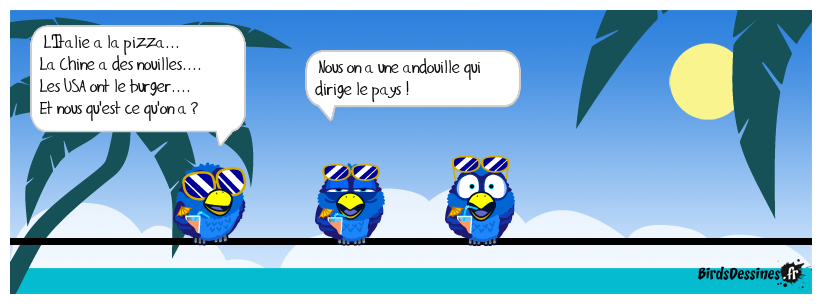 Case 1:Bird 1: L'Italie a la pizza... La Chine a des nouilles.... Les USA ont le burger.... Et nous qu'est ce qu'on a ? | Case 2: Bird 1: Nous on a une andouille qui dirige le pays ! | Case 3: