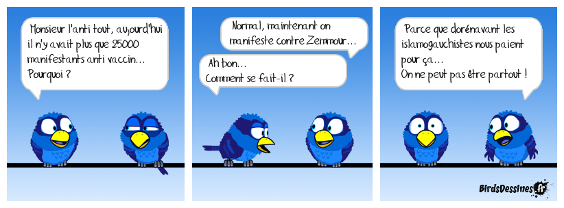 Case 1:Bird 1: Monsieur l'anti tout, aujourd'hui il n'y avait plus que 25000 manifestants anti vaccin... Pourquoi ? | Case 2: Bird 1: Normal, maintenant on manifeste contre Zemmour... Bird 2: Ah bon... Comment se fait-il ? | Case 3: Bird 1: Parce que dorénavant les islamogauchistes nous paient pour ça... On ne peut pas être partout !