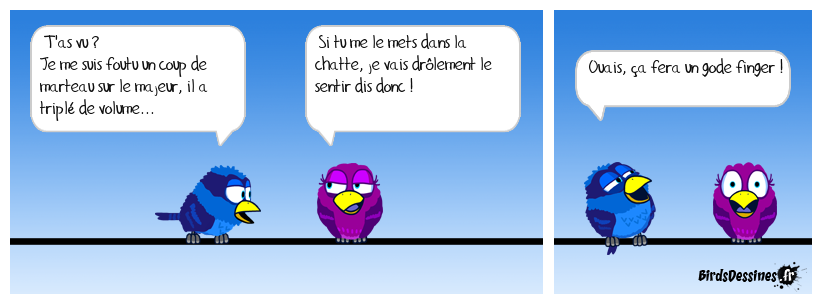 Case 1:Bird 1: T'as vu ? Je me suis foutu un coup de marteau sur le majeur, il a triplé de volume... | Case 2: Bird 1: Si tu me le mets dans la chatte, je vais drôlement le sentir dis donc ! | Case 3: Bird 1: Ouais, ça fera un gode finger !